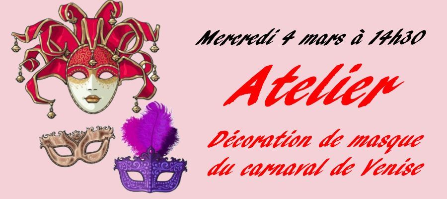 Pour découvrir la culture vénitienne, un atelier créatif de décoration de masques du carnaval de Venise sera proposé aux enfants et aux adultes. Cette activité familiale permettra à chacun de s'initier à l'art traditionnel du masque vénitien et de repartir avec sa propre création et un petit goûter (participation 4€)